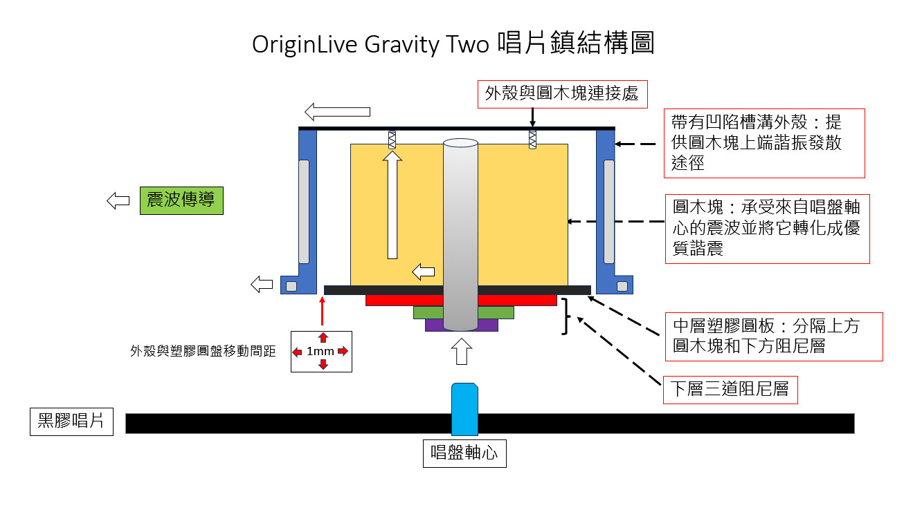 重力二號唱片鎮是OriginLive於2025年開發出來的新產品,它的外觀是由一圓形塑膠外殼所組成,圓形外殼高度是3公分,圍繞圓形外殼表面有12道凹陷溝槽,完全不同於原先重力一號唱片鎮外觀,它的中心部分有五層構造,可分成下方三層阻尼層,中間塑膠板,和上方實木區。重力二號唱片鎮重量為70克與重力一號唱片鎮相近,它的外殼與中心部分,是靠內部特定螺絲構造連接,圓形外殼與上端實木區連接方式沒有完全鎖死,中心部分與圓形外殼之間保有特定鬆動關係,中心部分可以上下移動1mm,中心部分沿著圓形外殼向任何方向任意晃動1mm,如此鬆動構造仍然保有與重力一號唱片鎮相似導震思維,黑膠唱盤運轉過程,來自轉盤中軸的震動,會傳導進入重力二號唱片鎮內部圓木塊,產生優質諧震,多餘的諧震動能,再經由獨特外殼構造發散掉。